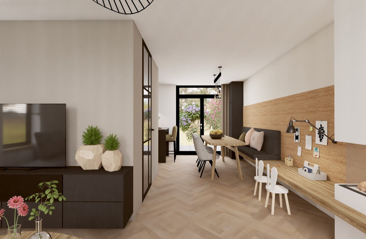 In deze smalle ruimte tussen de keuken en eetkamer hebben we slim gebruikgemaakt van de beschikbare ruimte. Het maatwerkmeubel biedt opbergruimte en bevat tevens een gezellige kinderspeelhoek, waardoor het een multifunctioneel onderdeel van de woning wordt. Door een vaste bank in de eetkamer te integreren, besparen we aanzienlijk wat ruimte en creëren we een knusse eetruimte voor het gezin.