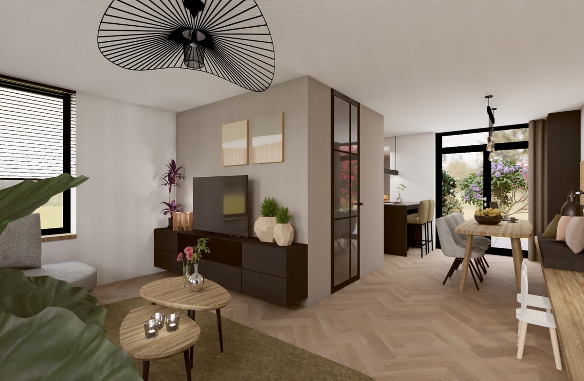 Het interieurontwerp maakt gebruik van warme materialen, zoals houten accenten en een geïntegreerde haard, om een knusse sfeer te creëren. De combinatie van strakke lijnen en natuurlijke materialen zorgt voor een modern en tijdloos interieur. De houtopslag onder de haard voegt een authentiek, rustiek detail toe dat perfect aansluit bij de wensen van de bewoners.