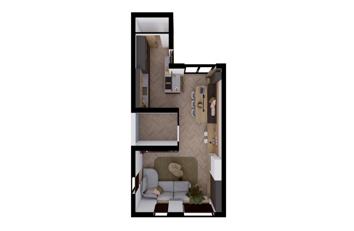De bewoners hadden oorspronkelijk de wens voor een kookeiland, maar door de beperkte breedte van de keuken bleek dit niet mogelijk. In plaats daarvan hebben we een schiereiland ontworpen dat dezelfde functionaliteit biedt. Dit schiereiland bevat ruimte voor twee barkrukken, waardoor er alsnog een bar ontstaat waar de bewoners kunnen genieten van een informele maaltijd of een gezellige koffiepauze.