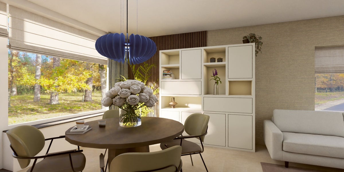 Voor deze woning in Zwolle ontwierp ik een compleet interieuradvies voor de woonkamer, eetkamer, hal en een maatwerk keuken. De huidige inrichting was verouderd en voldeed niet meer aan de wensen van de bewoner. Daarom koos ik voor een tijdloos, modern en warm interieur waarin comfort en functionaliteit centraal staan. Hieronder ziet u het ontwerp vs. de huidige situatie.