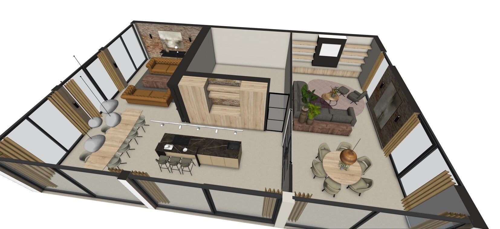Vooraf werk ik de betreffende ruimte(s) uit in 3D. Dit geeft een heldere basisweergave van de ruimte en zorgt ervoor dat we tijdens het advies gericht en efficiënt keuzes kunnen maken.